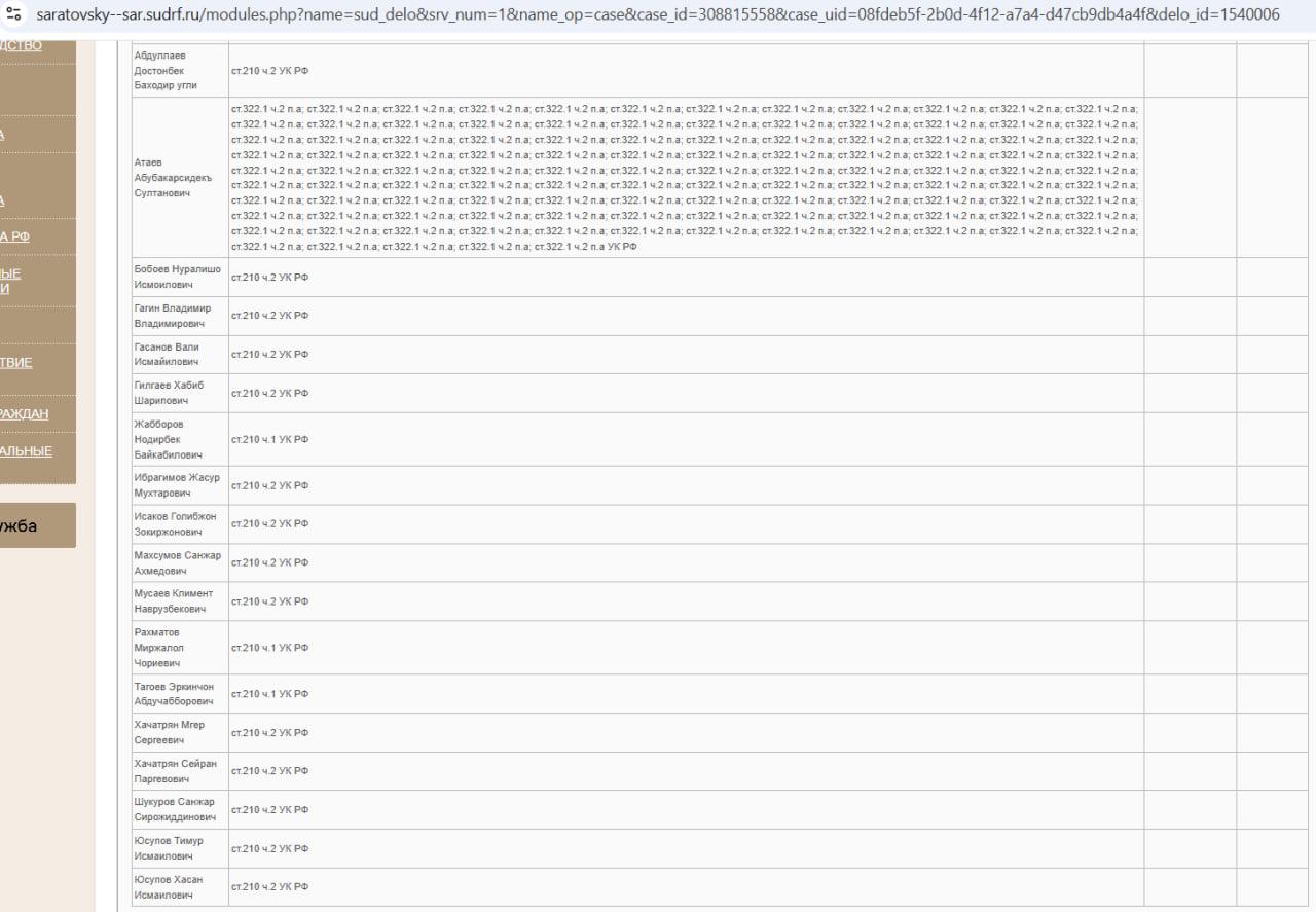 По статье об организации незаконного въезда проходит Атаев Абубакарсидек. Обвинения по созданию преступного сообщества предъявлены Нодирбеку Жабборову, Миржалолу Рахматову и Эркинчону Тагоеву. Ещё 14 фигурантов обвиняются в участии в ОПС.