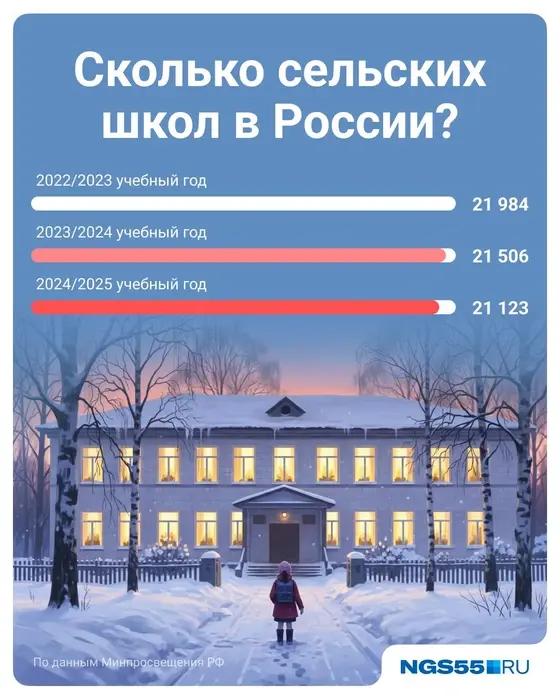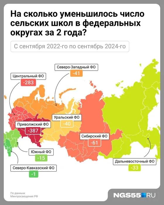 В 2022-2024 учебных годах количество сельских школ в России уменьшилось с 21 984 до 21 123, сократившись на 861 заведение. По федеральным округам динамика была следующей: