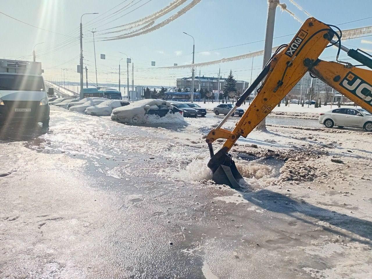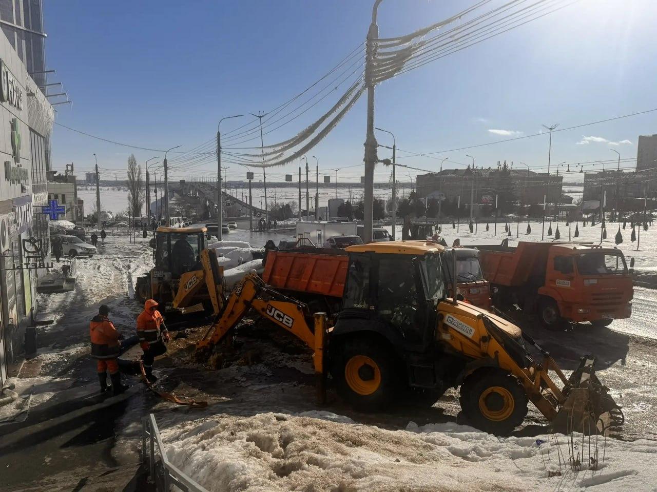 На месте работают несколько экскаваторов и грузовых автомобилей КАМАЗ, которые роют котлован для ликвидации течи. Вода с места прорыва стекает мимо жилых комплексов, включая ЖК «Елена», в сторону новой набережной и Волги.