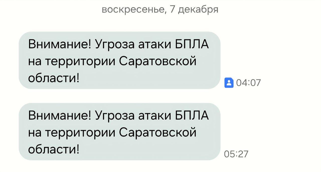Росавиция отменила ограничения на полёты в 6:57 утра. О прекращении угрозы БПЛА жителям Саратовской области также сообщили по SMS: первое уведомление пришло в 7:11, а второе — в 9:07.