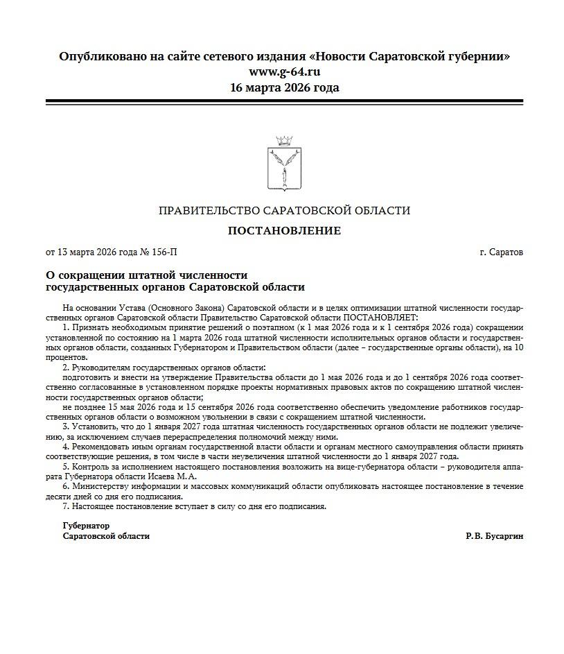 Губернатор Саратовской области Роман Бусаргин утвердил постановление, предусматривающее поэтапное сокращение численности региональных исполнительных и государственных органов власти на 10%. Документ размещён на официальном портале правительства области.