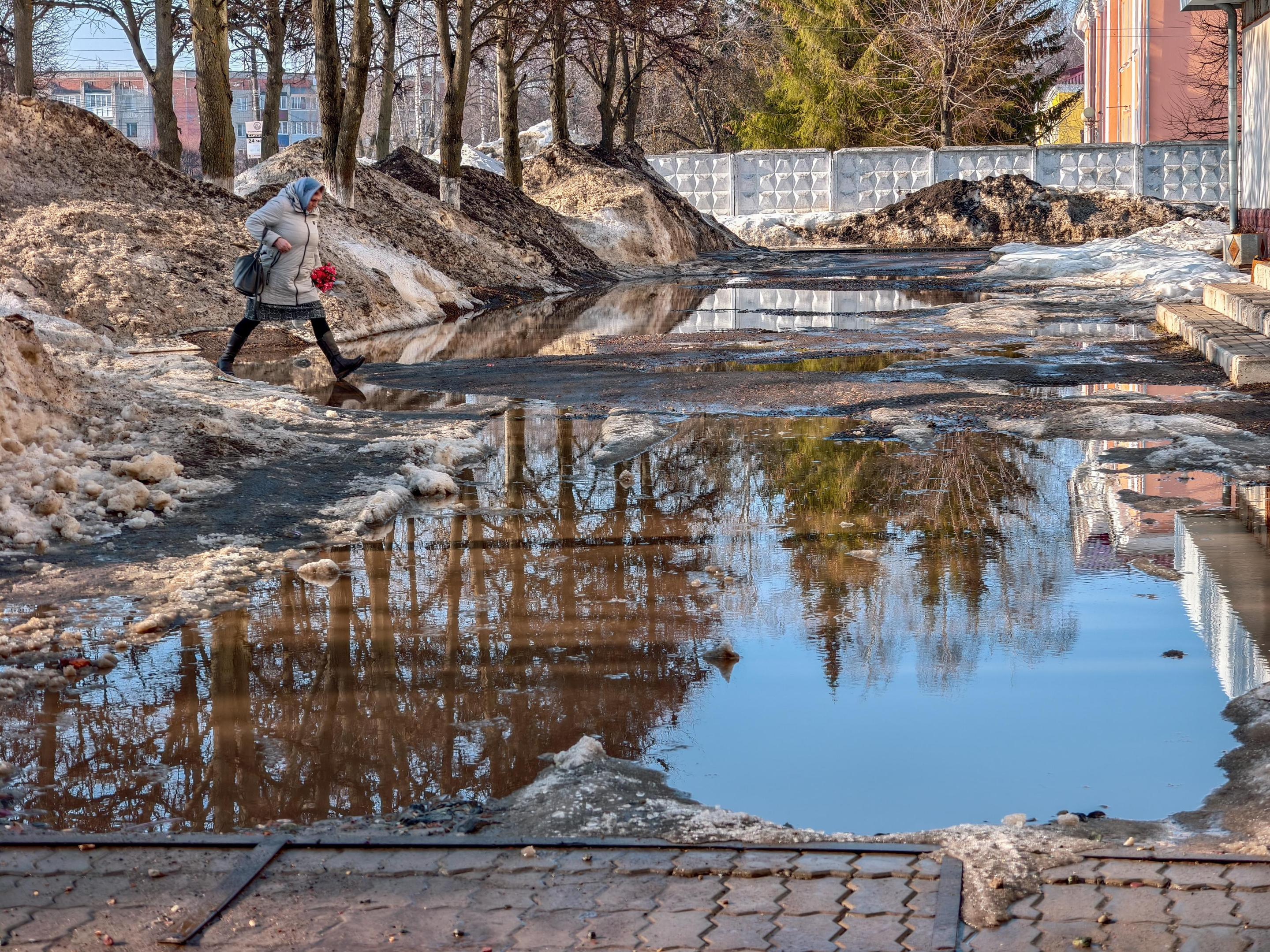 Весенняя погода в России часто сопровождается таянием снега и лужами.