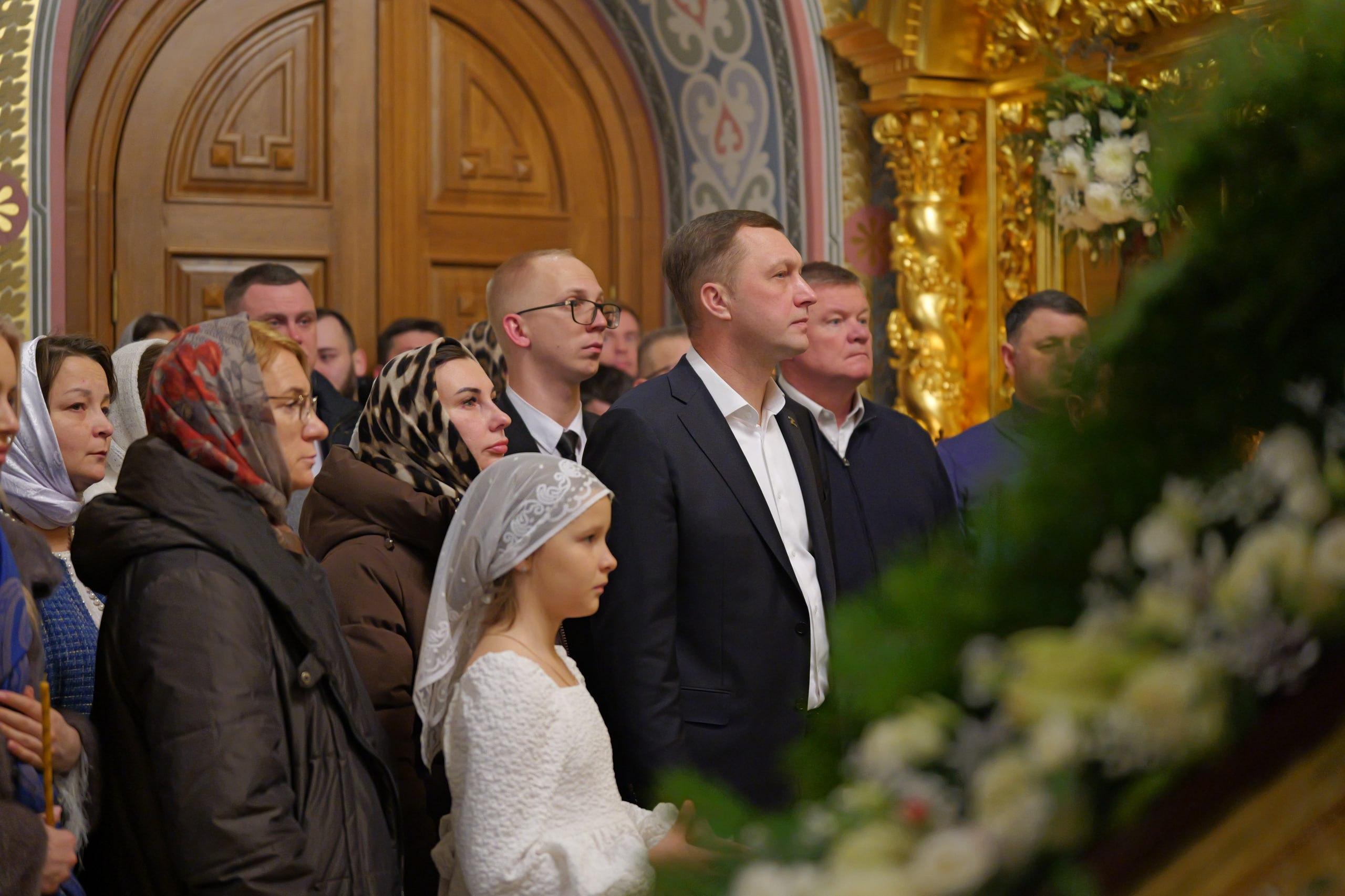 Губернатор Роман Бусаргин и мэр Михаил Исаев присутствовали на рождественской службе в Троицком соборе.