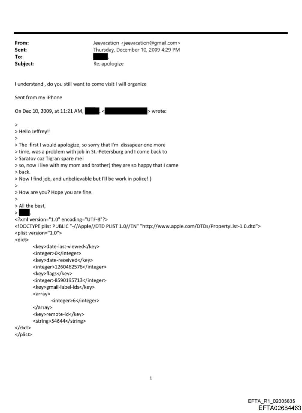 Девушка добавила, что её семья рада возвращению. Она находилась в поиске работы и, как ни невероятно, планировала трудоустроиться в местные органы правопорядка. Спросив о делах Эпштейна и пожелав ему всего наилучшего, она получила ответ: «Я понимаю. Ты всё еще хочешь приехать в гости? Я всё организую».